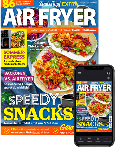 während meines letzten Urlaubs hatte ich meinen Airfryer einer Nachbarin aus geliehen, die noch keinen besitzt und ihn unbedingt mal ausprobieren wollte. Die Rück-Übergabe war für später vereinbart, daher blieb ich einige Tage ohne Heißluftfritteuse. Und das war ein bisschen wie beim Stromausfall: „Ach, ich könnte ja schnell ein Laugenbrötchen … – ach nein, geht ja gar nicht“ oder „Das wärme ich einfach schnell … – ach so, nee, hab ja keinen Airfryer.“ Inzwischen ist das gute Stück wieder an seinem Platz und meine Routinen laufen nicht mehr ins Leere. Durch diesen „Ausnahmezustand“ wurde mir allerdings sehr deutlich vor Augen geführt, wie viel Zeit mir meine HLF spart und wie selten ich heute noch meinen Backofen für Arbeitsschritte in Betracht ziehe. Und wie du in unserem Vergleich Backofen vs. Airfryer feststellen wirst, ist das nicht nur ein Gefühl. Tatsächlich sind die Turbo-Maschinen echte Alltagsbeschleuniger. Das trifft übrigens auch auf unsere superschnellen und einfachen Rezepte dieser Sommer-Ausgabe zu. Denn wer hat schon Lust, jetzt lang in der Küche zu stehen? Ich jedenfalls nicht. Ich setze mich lieber mit einer knusprigen Kirschtasche auf die Terrasse und genieße die Sonne – sowie das gute Gefühl, meinen Küchenhelden auch für das Abendessen an Ort und Stelle zu wissen. Ich wünsche dir viel Spaß beim Stöbern durch unsere Sommer-Ausgabe und freue mich, wenn du neue, köstliche Inspiration für dich und deinen Airfryer mitnimmst. Vivien Koitka, Chefredakteurin